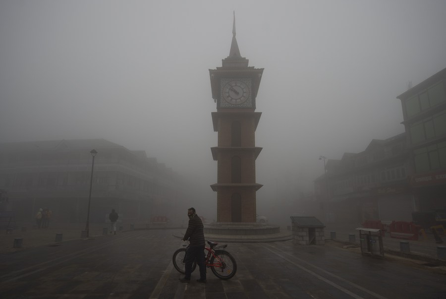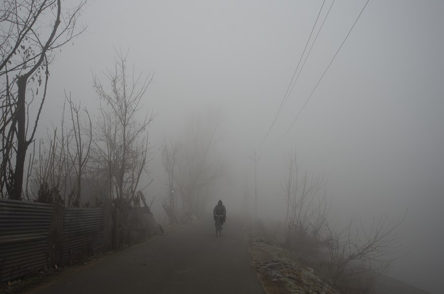 A man rides a bicycle amid dense fog in Srinagar city, Indian-controlled Kashmir, Dec. 25, 2023. (Xinhua/Javed Dar)