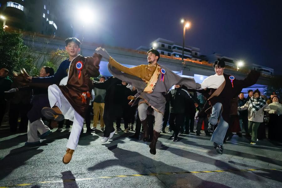 Members of a Guozhuang dance troupe dance at a square in Chengdu, southwest China's Sichuan Province, Dec. 16, 2023. (Xinhua/Shen Bohan)Dancers (front), who come from a Guozhuang dance troupe in Yushu Tibetan Autonomous Prefecture of Qinghai Province, perform with local dancers at a square in Chengdu, southwest China's Sichuan Province, Dec. 23, 2023. (Xinhua/Shen Bohan)A girl dances Guozhuang at a square in Chengdu, southwest China's Sichuan Province, Dec. 23, 2023. (Xinhua/Shen Bohan)A girl dances Guozhuang with members of a Guozhuang dance troupe at a square in Chengdu, southwest China's Sichuan Province, Dec. 16, 2023. (Xinhua/Shen Bohan)Yanggyi (R, front) and her teammates make preparations for a Guozhuang dance party in Chengdu, southwest China's Sichuan Province, Dec. 16, 2023. (Xinhua/Shen Bohan)