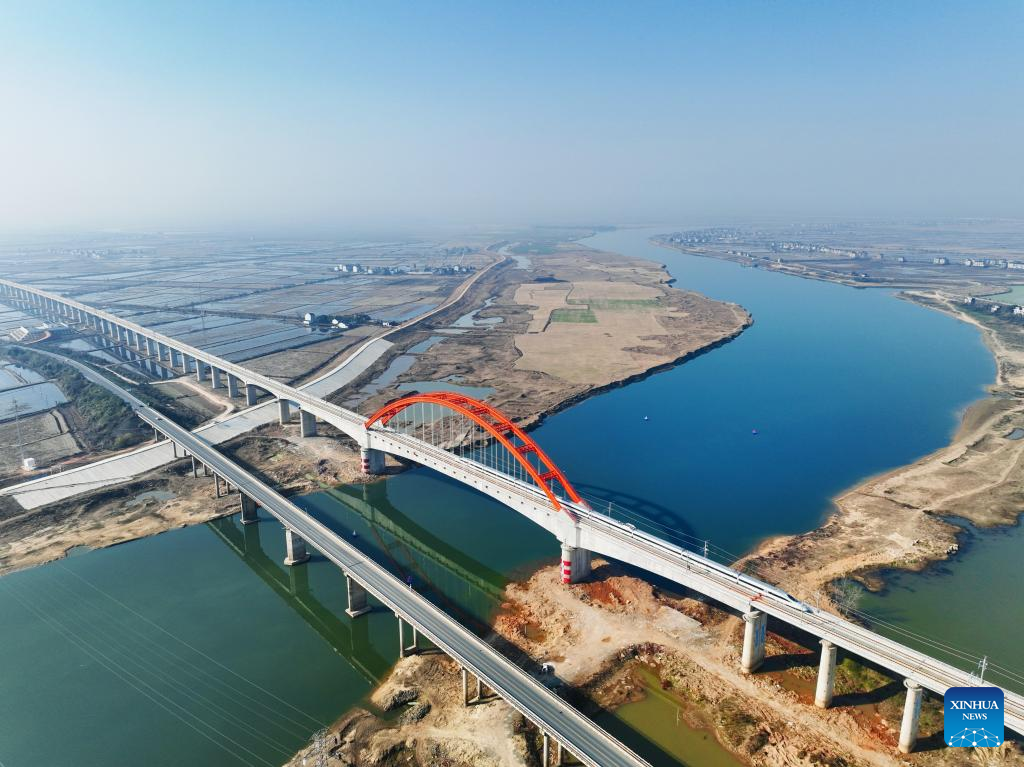 This aerial photo taken on Dec. 27, 2023 shows a high-speed train passing a grand bridge at Poyang Lake on Hangzhou-Nanchang high-speed railway in east China. The high-speed railway line linking Huangshan and Nanchang in east China started operation on Wednesday, marking the full operation of the Hangzhou-Nanchang high-speed railway. (Xinhua/Xing Guangli)