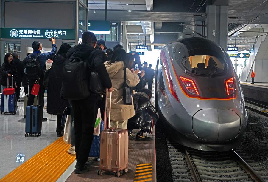 Passengers prepare to board a train at the Nanchang East Railway Station in Nanchang, east China's Jiangxi Province, Dec. 27, 2023. (Xinhua/Xing Guangli)A bullet train runs on the Poyang Lake grand bridge of the Hangzhou-Nanchang high-speed railway on Dec. 27, 2023. (Xinhua/Xing Guangli)A bullet train is about to depart from the Nanchang East Railway Station in Nanchang, east China's Jiangxi Province, Dec. 27, 2023. (Xinhua/Xing Guangli)This photo taken on Dec. 27, 2023 shows a Jingdezhen porcelain decoration on a train running along the Hangzhou-Nanchang high-speed railway. (Xinhua/Xing Guangli)Passengers pose for photos at the Nanchang East Railway Station in Nanchang, east China's Jiangxi Province, Dec. 27, 2023. (Xinhua/Wan Xiang)Train No. G4012 is to depart from the Nanchang East Railway Station in Nanchang, east China's Jiangxi Province, Dec. 27, 2023. (Xinhua/Wan Xiang)Train No. G4012 arrives at the Jingdezhen North Railway Station in Jingdezhen, east China's Jiangxi Province, Dec. 27, 2023. (Xinhua/Wan Xiang)Actors perform on train No. G4012 running along the Hangzhou-Nanchang high-speed railway, Dec. 27, 2023. (Xinhua/Wan Xiang)A bullet train departs from the Yixian East Railway Station in Huangshan, east China's Anhui Province, Dec. 27, 2023. (Photo by Lyu Jinyi/Xinhua)