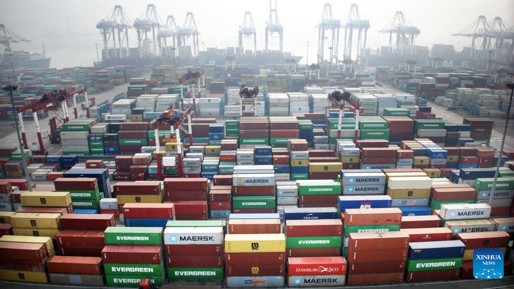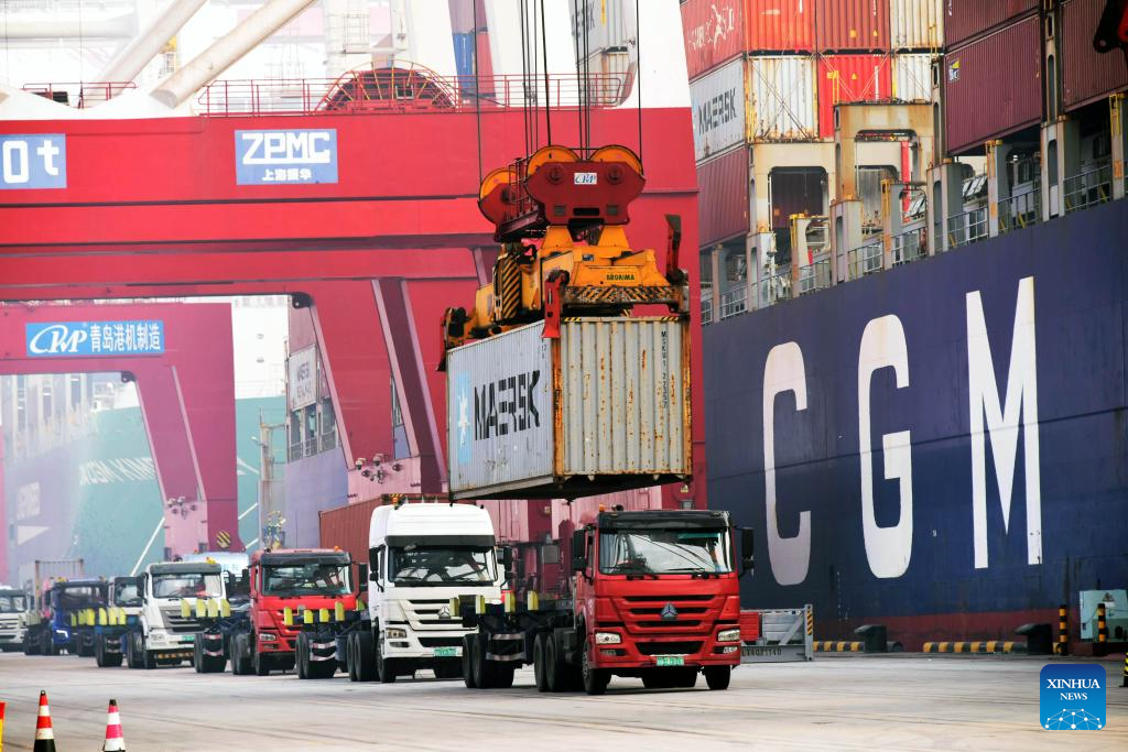 Trucks transport containers at Qianwan Container Terminal of Qingdao Port in east China's Shandong Province, Dec. 27, 2023. By Dec. 27, east China's Qingdao Port has handled over 30 million twenty-foot equivalent unit (TEU) containers in 2023, reaching the target of the year. (Xinhua/Li Ziheng)