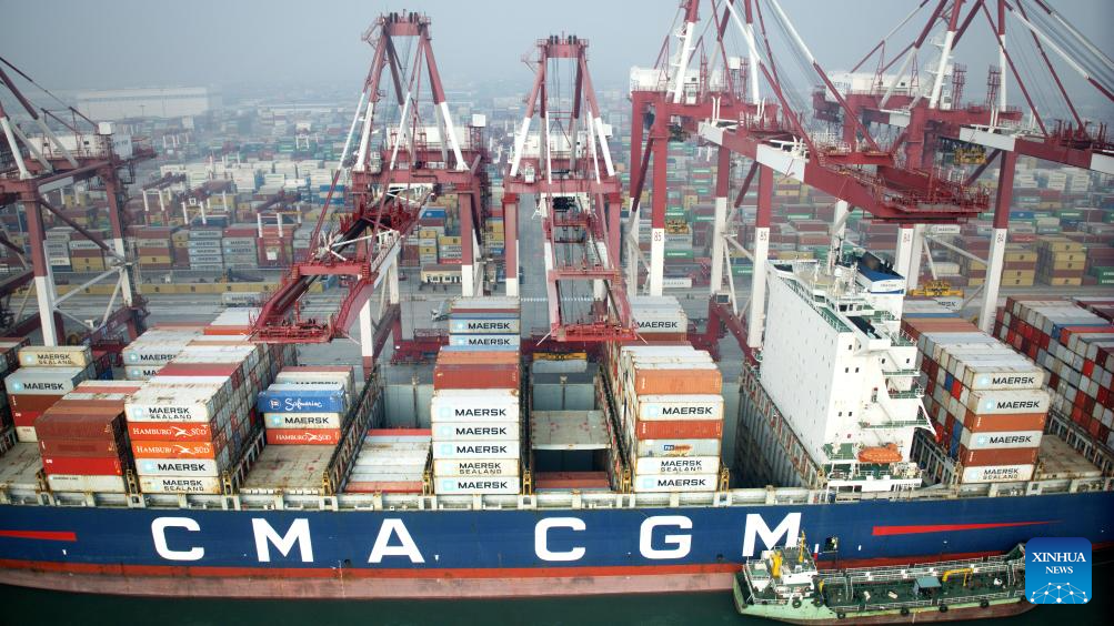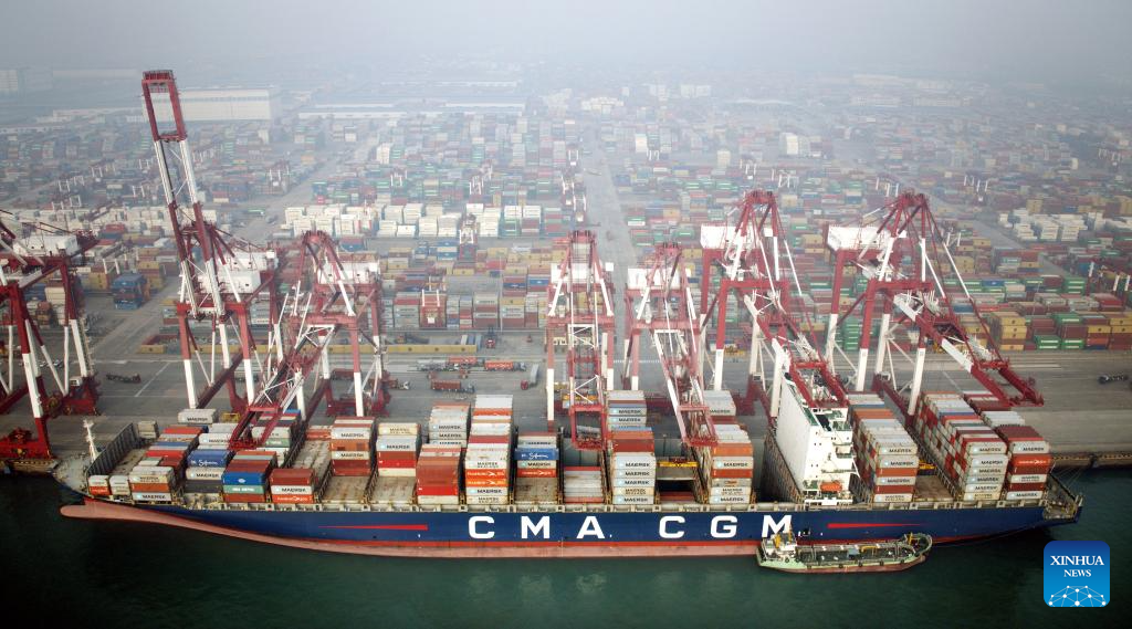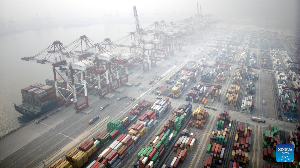 This aerial photo taken on Dec. 27, 2023 shows the Qianwan Container Terminal of Qingdao Port in east China's Shandong Province. By Dec. 27, east China's Qingdao Port has handled over 30 million twenty-foot equivalent unit (TEU) containers in 2023, reaching the target of the year. (Xinhua/Li Ziheng)