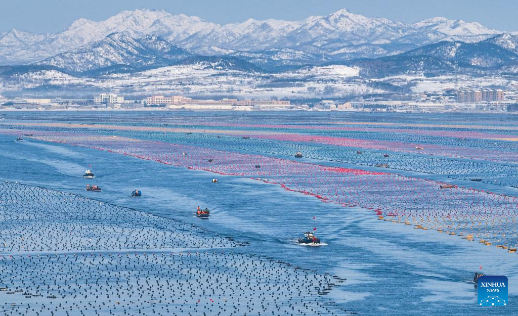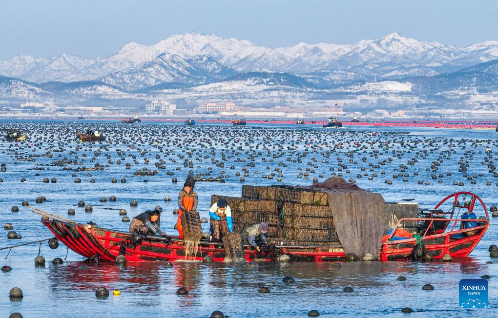This aerial photo taken on Dec. 27, 2023 shows fishermen harvesting abalones at a marine ranch in Ailun Bay of Rongcheng City, east China's Shandong Province. (Photo by Li Xinjun/Xinhua)