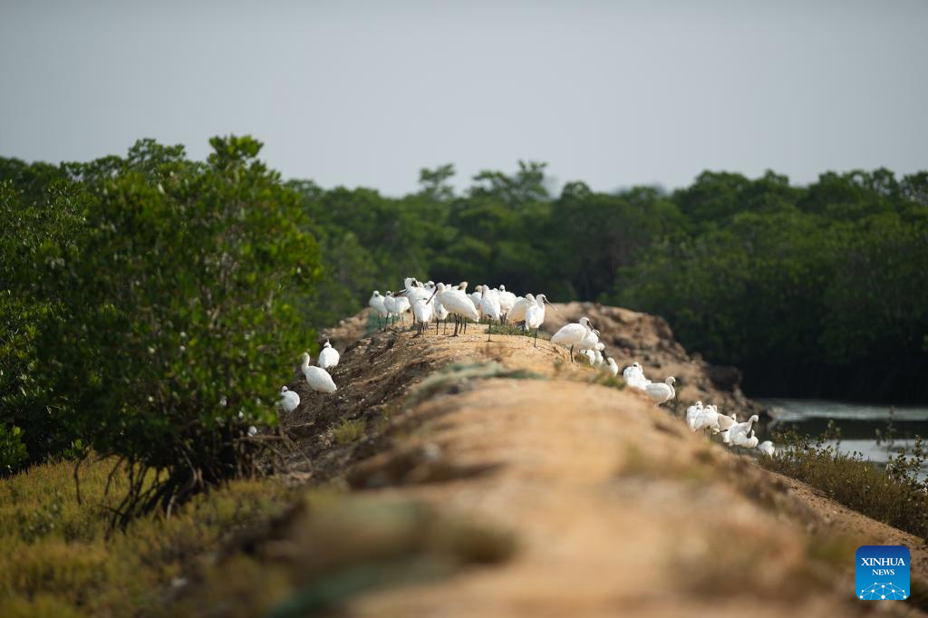 A flock of black-faced spoonbills are seen at a wetland park in Danzhou, south China's Hainan Province, Dec. 27, 2023. In recent years, Hainan has been strengthening the protection of wetlands and birds. The number of black-faced spoonbills wintering here has steadily increased. (Xinhua/Zhang Liyun)