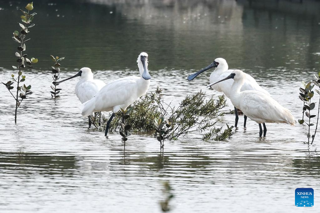 Black-faced spoonbills are seen at a wetland park in Danzhou, south China's Hainan Province, Dec. 27, 2023. In recent years, Hainan has been strengthening the protection of wetlands and birds. The number of black-faced spoonbills wintering here has steadily increased. (Xinhua/Fan Yuqing)