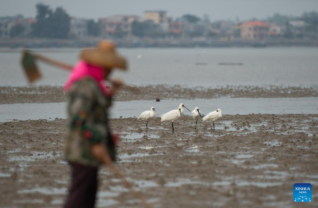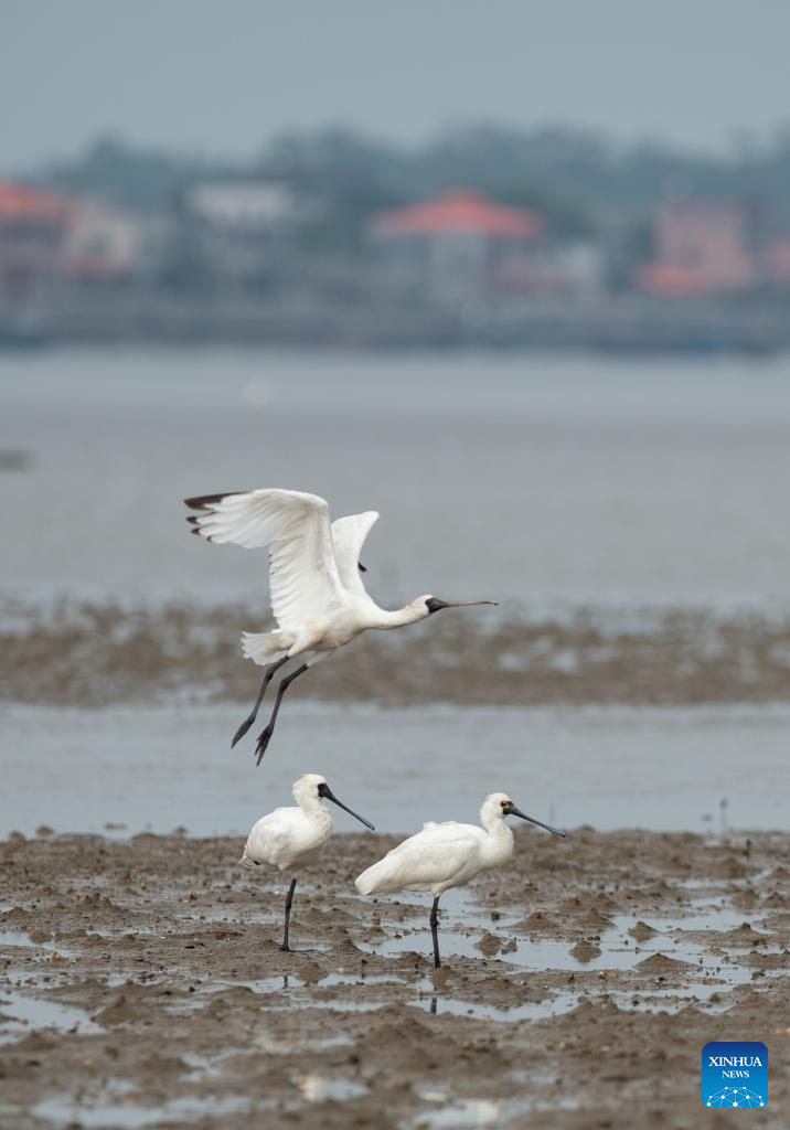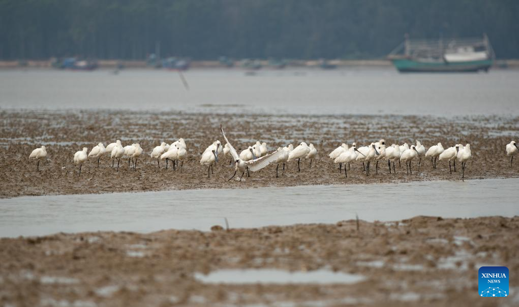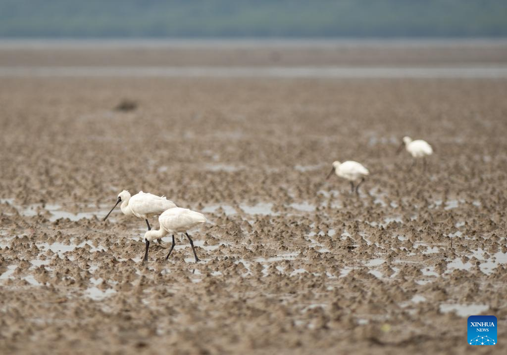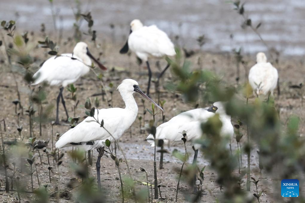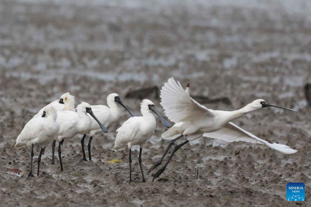 A flock of black-faced spoonbills forage at a wetland park in Danzhou, south China's Hainan Province, Dec. 27, 2023. In recent years, Hainan has been strengthening the protection of wetlands and birds. The number of black-faced spoonbills wintering here has steadily increased. (Xinhua/Zhang Liyun)