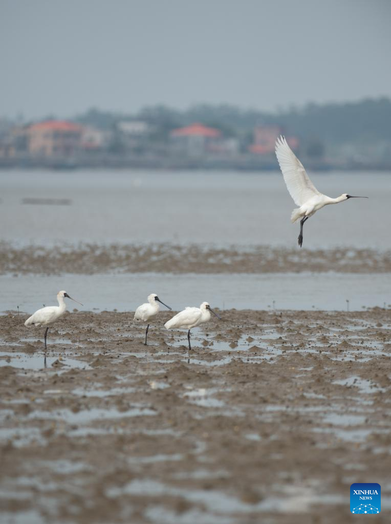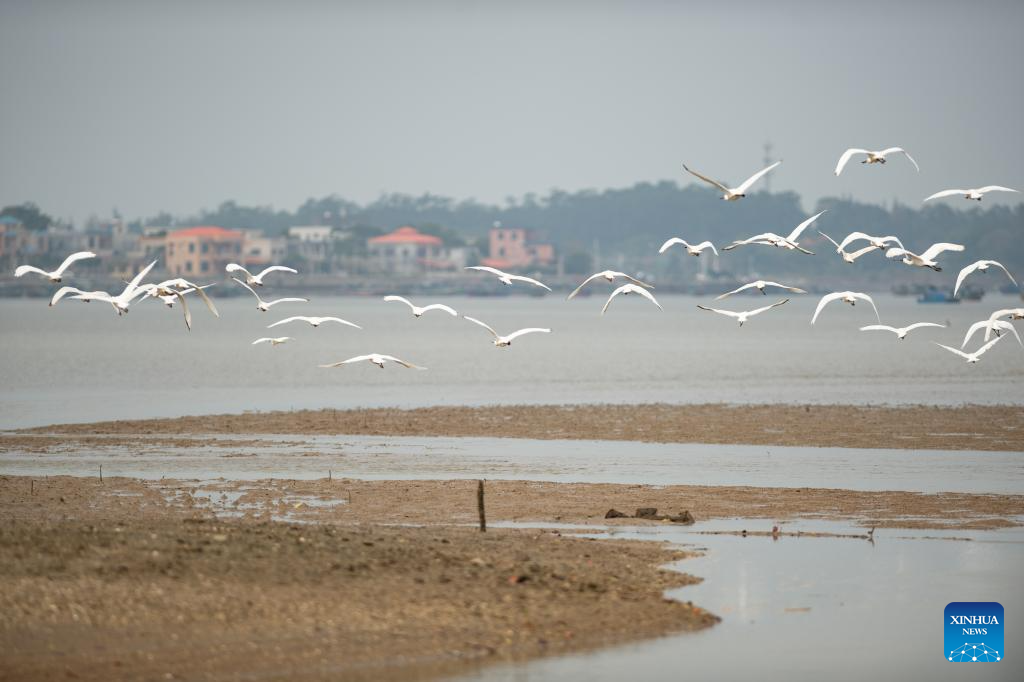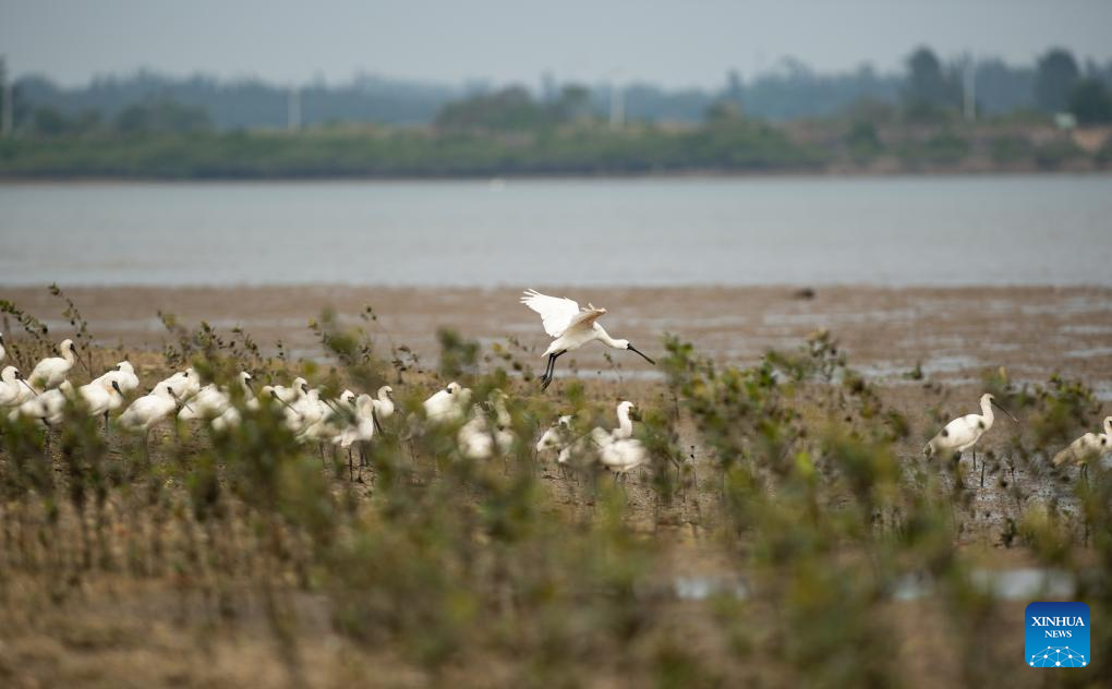 A flock of black-faced spoonbills fly over a wetland park in Danzhou, south China's Hainan Province, Dec. 27, 2023. In recent years, Hainan has been strengthening the protection of wetlands and birds. The number of black-faced spoonbills wintering here has steadily increased. (Xinhua/Fan Yuqing)