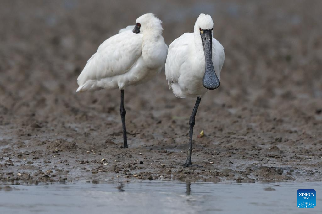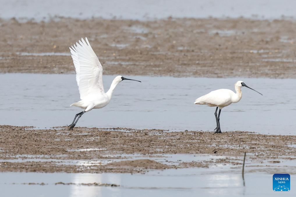 Two black-faced spoonbills are seen at a wetland park in Danzhou, south China's Hainan Province, Dec. 27, 2023. In recent years, Hainan has been strengthening the protection of wetlands and birds. The number of black-faced spoonbills wintering here has steadily increased. (Xinhua/Zhang Liyun)