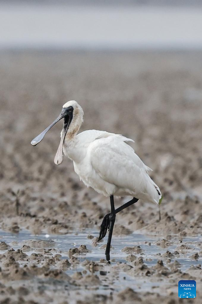 A black-faced spoonbill is pictured at a wetland park in Danzhou, south China's Hainan Province, Dec. 27, 2023. In recent years, Hainan has been strengthening the protection of wetlands and birds. The number of black-faced spoonbills wintering here has steadily increased. (Xinhua/Zhang Liyun)