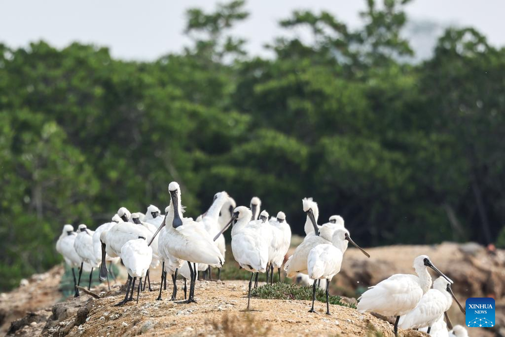 A flock of black-faced spoonbills are seen at a wetland park in Danzhou, south China's Hainan Province, Dec. 27, 2023. In recent years, Hainan has been strengthening the protection of wetlands and birds. The number of black-faced spoonbills wintering here has steadily increased. (Xinhua/Fan Yuqing)