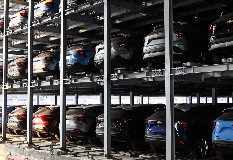 This photo taken on Dec. 27, 2023 shows vehicles parked at a smart stereo garage at Yantai Port in Yantai, east China's Shandong Province. (Xinhua/Lan Hongguang)