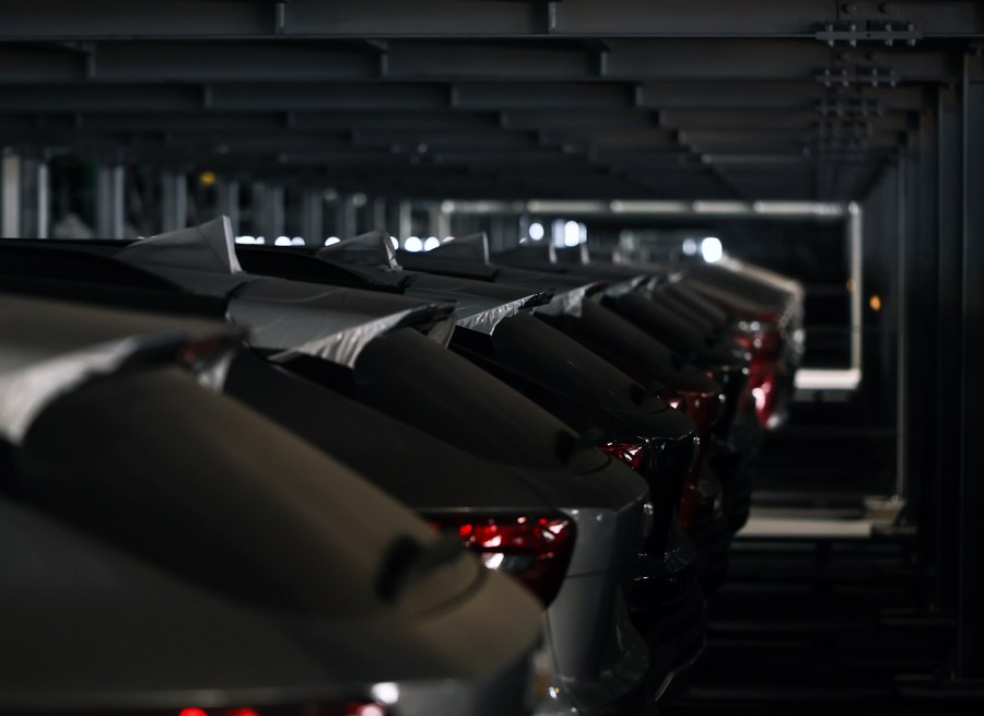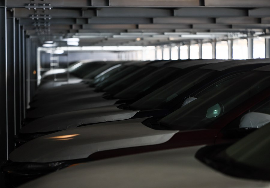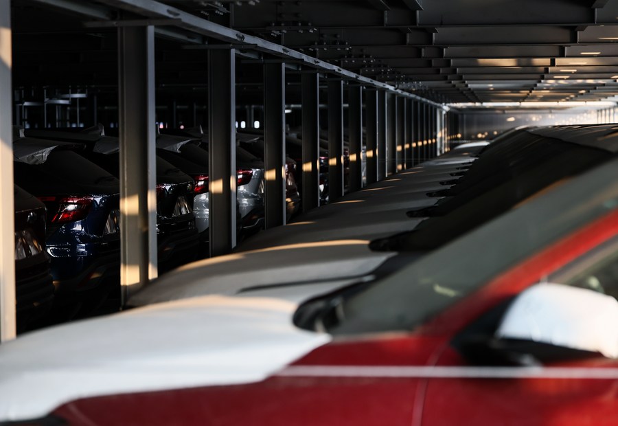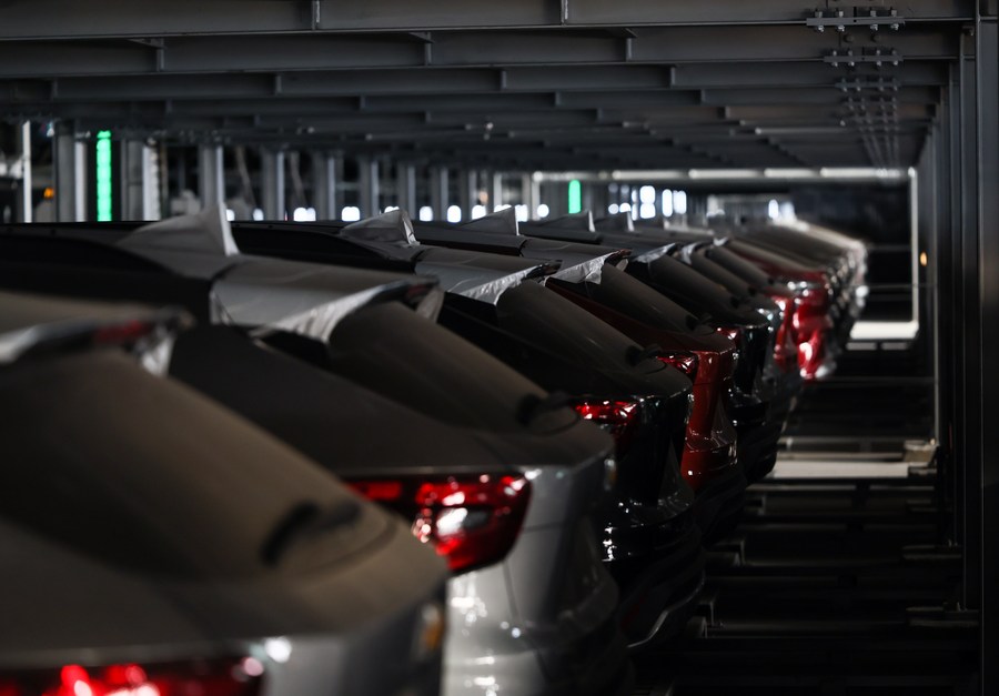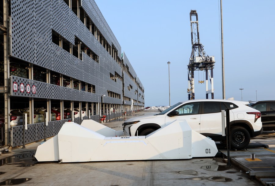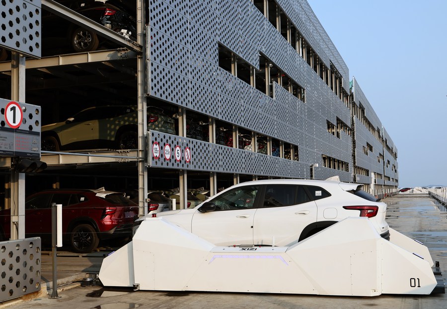This photo taken on Dec. 27, 2023 shows a car being automatically transported into a stereo garage at Yantai Port in Yantai, east China's Shandong Province. (Xinhua/Lan Hongguang)