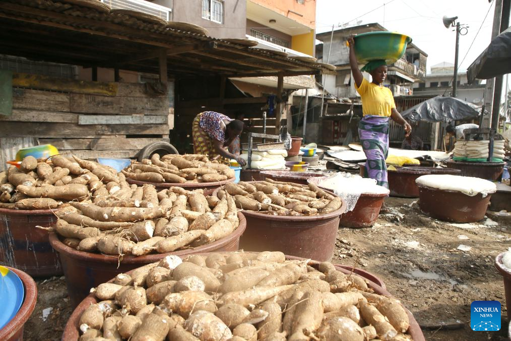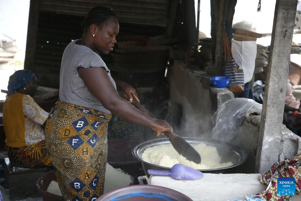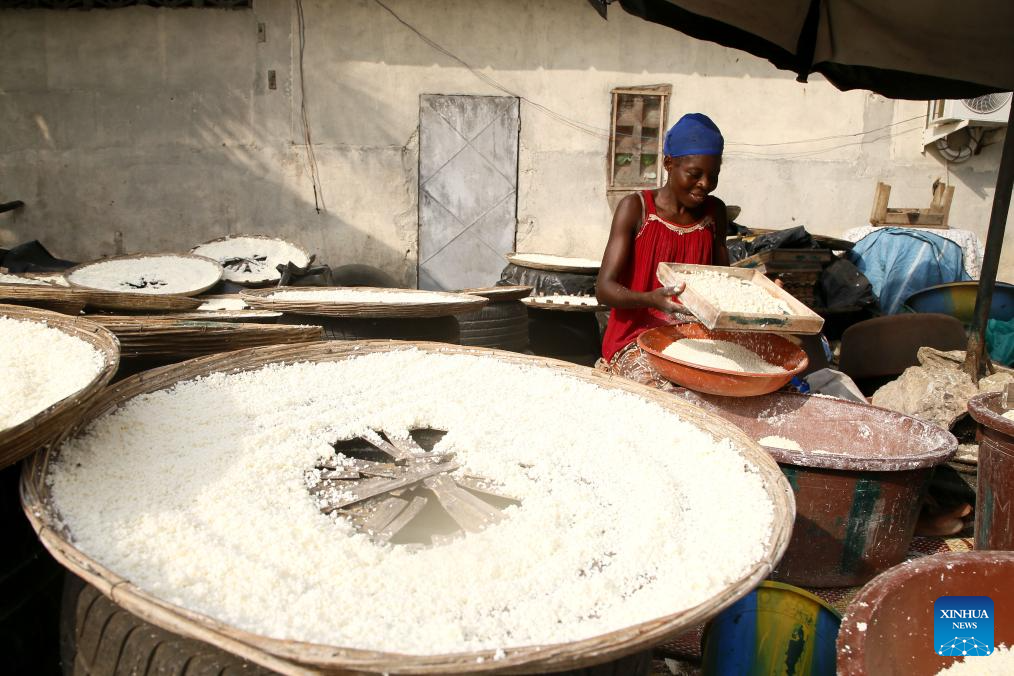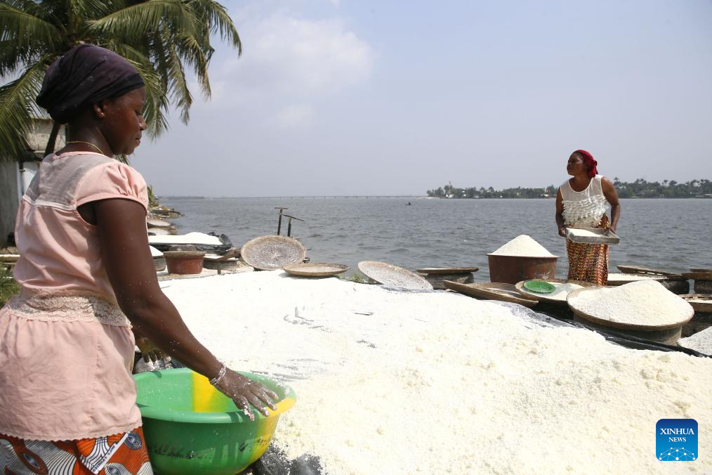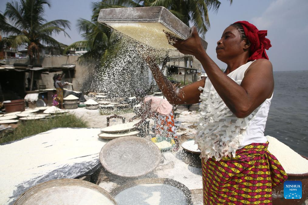 Women dry cassava root semolina in the sun in Abidjan, Cote d'Ivoire, on Dec. 27, 2023. Cassava is an important staple food in Africa. Attieke, a fermented flour made from cassava roots, originated from the lagoon ethnic groups of the south of Cote d'Ivoire, and has become an essential dish for the locals. (Photo by Yvan Sonh/Xinhua)