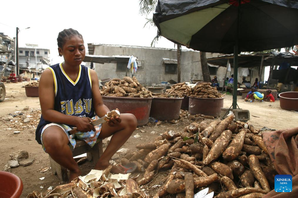 A woman peels cassava roots to prepare attieke in Abidjan, Cote d'Ivoire, on Dec. 27, 2023. Cassava is an important staple food in Africa. Attieke, a fermented flour made from cassava roots, originated from the lagoon ethnic groups of the south of Cote d'Ivoire, and has become an essential dish for the locals. (Photo by Yvan Sonh/Xinhua)