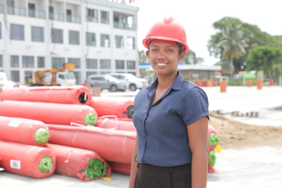 Photo taken on Dec. 20, 2023 shows Katriena Wong at the construction site of Nausori Plaza in Nausori, Fiji. (Photo by Sang Qinlong/Xinhua)