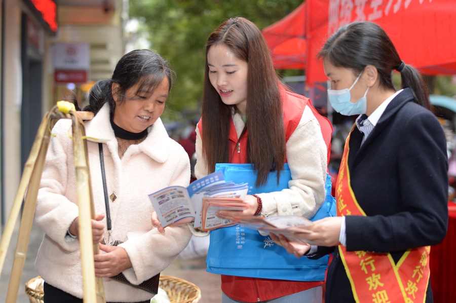 A woman learns about Internet security and anti-telecom fraud on a street in Yuping Dong Autonomous County, Tongren City, southwest China's Guizhou Province, Oct. 16, 2021. (Xinhua/Yang Ying)