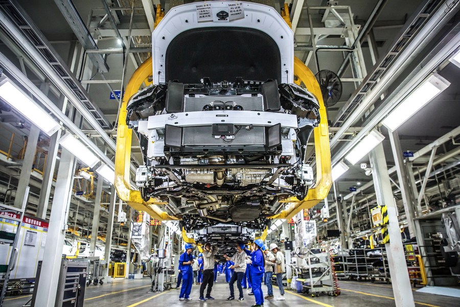 This undated photo shows a production line of new energy vehicles (NEVs) of BYD in Shenzhen, south China's Guangdong Province. (BYD/Handout via Xinhua)