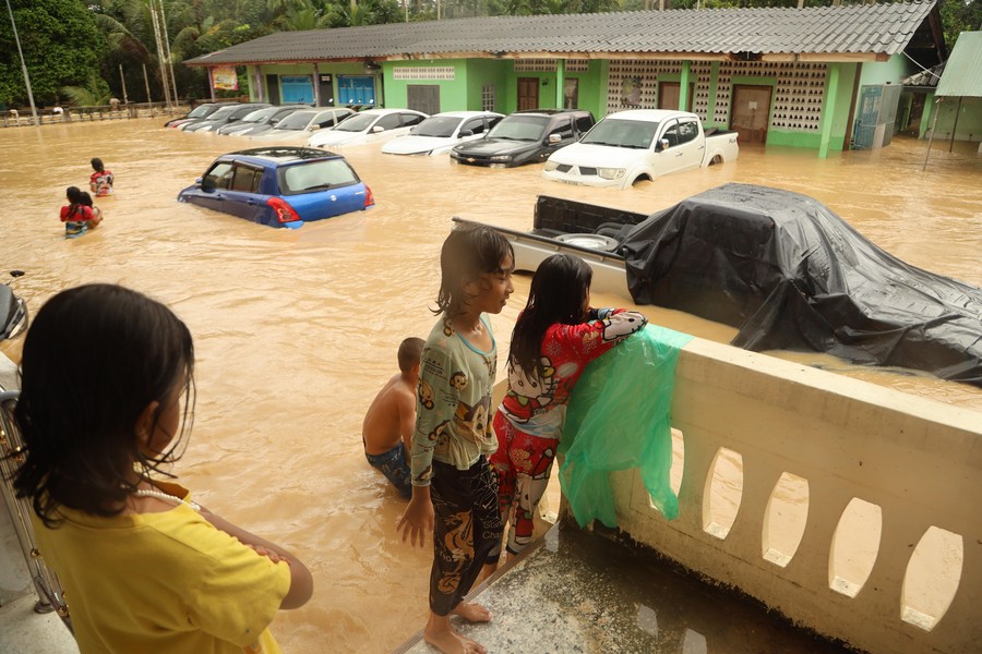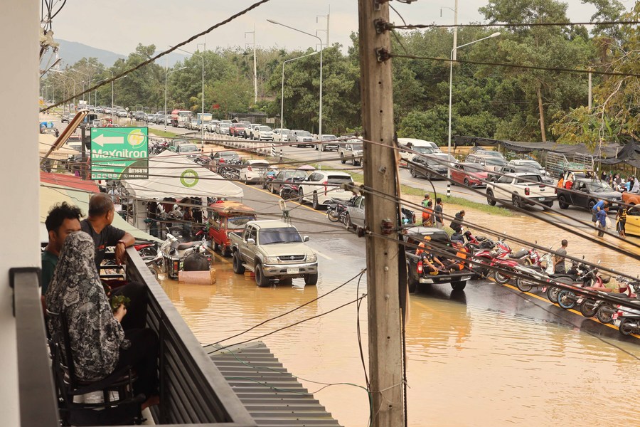 People look at flooded roads in Pattani, Thailand, Dec. 27, 2023. (Xinhua)