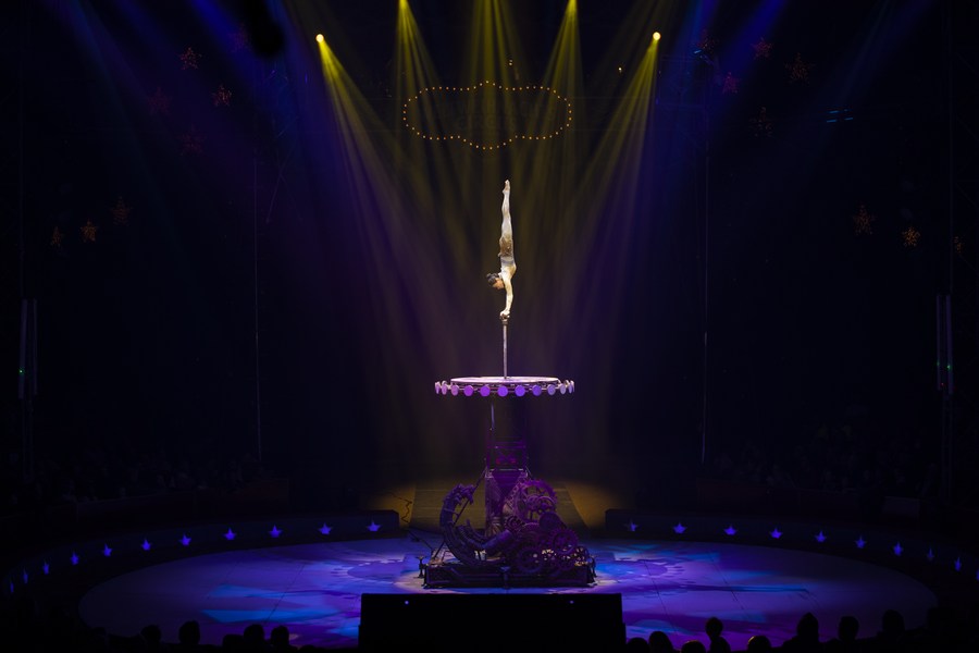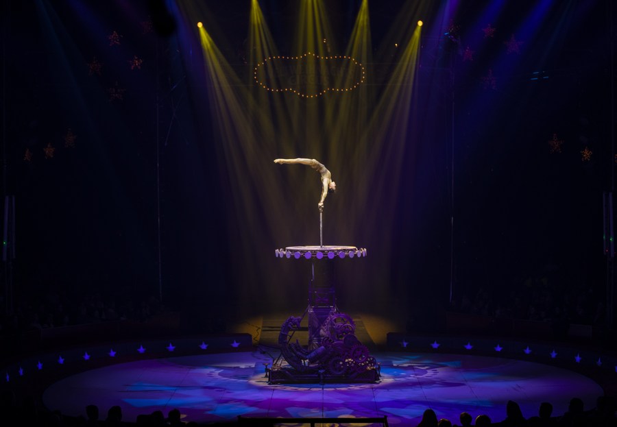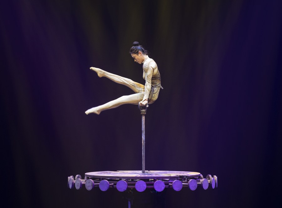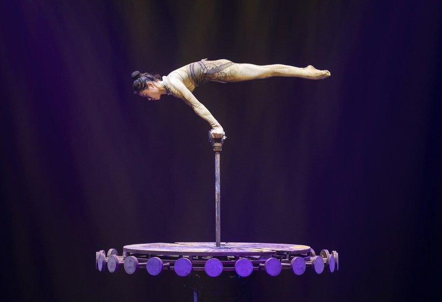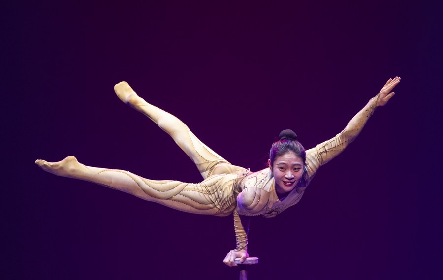 Acrobat Wang Mengchen of China's Jiangsu Acrobatic Troupe performs in Stuttgart, Germany, Dec. 28, 2023.(Xinhua/Zhang Fan)