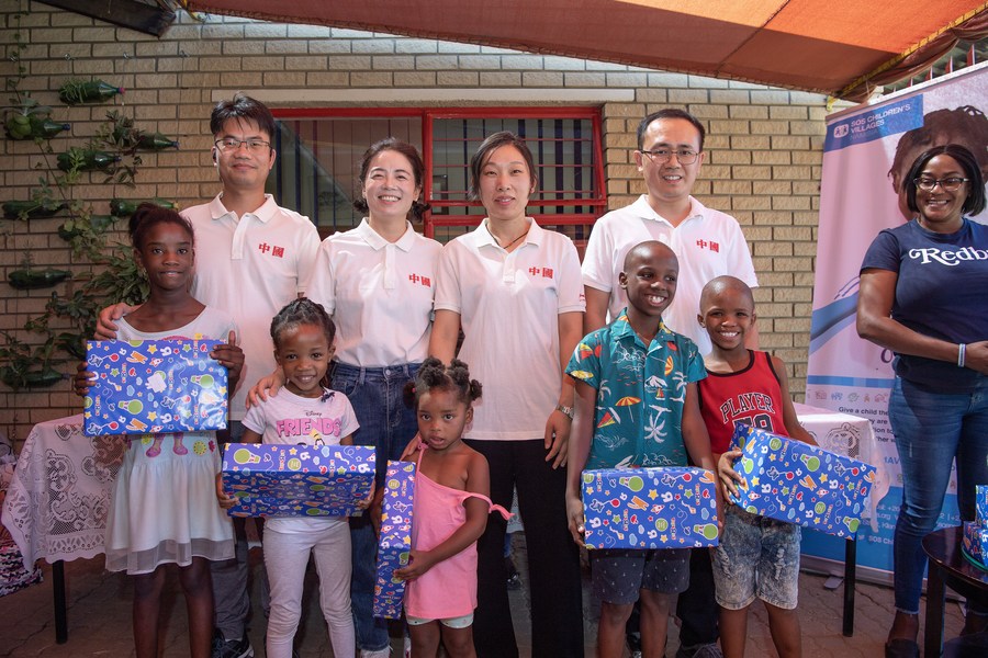 Members of a Chinese medical team pose for a group photo with children of the SOS Children's Village in Windhoek, Namibia, Dec. 11, 2023. (Photo by Ndalimpinga Iita/Xinhua)