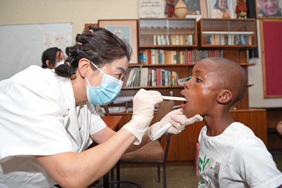 A member of a Chinese medical team examines a child's oral cavity at the SOS Children's Village in Windhoek, Namibia, Dec. 11, 2023. (Photo by Ndalimpinga Iita/Xinhua)