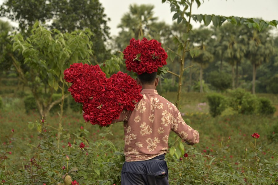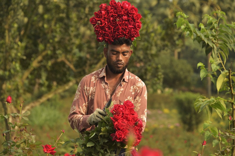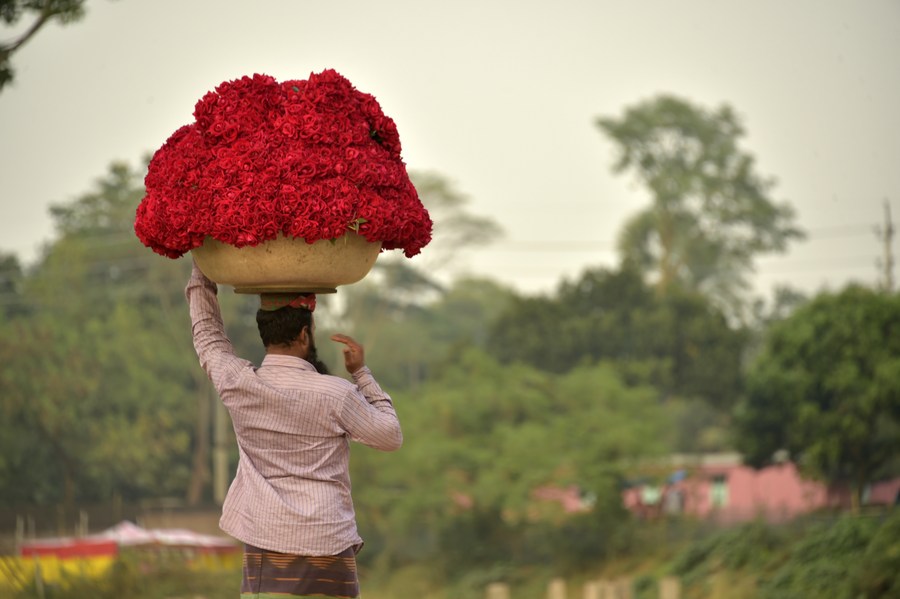 A gardener carries freshly picked roses on his head and shoulder in Savar, Bangladesh, Dec. 28, 2023. (Xinhua)