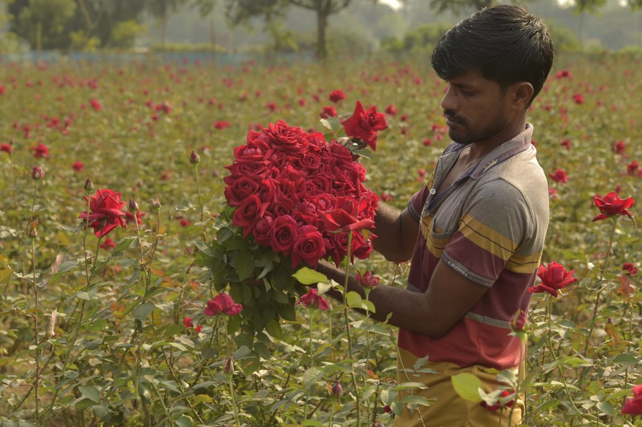 A gardener picks roses in Savar, Bangladesh, Dec. 28, 2023. (Xinhua)