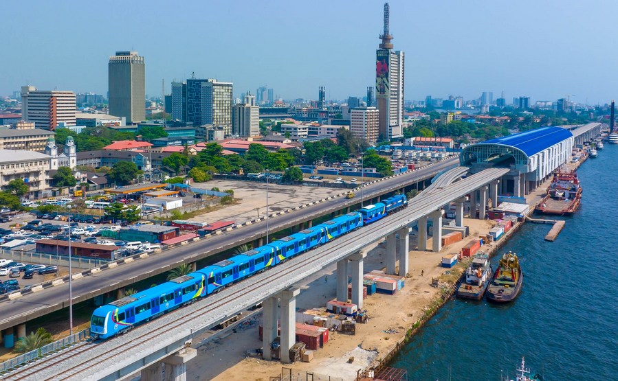 This photo taken on Dec. 21, 2022, shows a train of a light rail project running during a completion ceremony in Lagos, Nigeria. (Photo by Tope Ayoku/Xinhua)