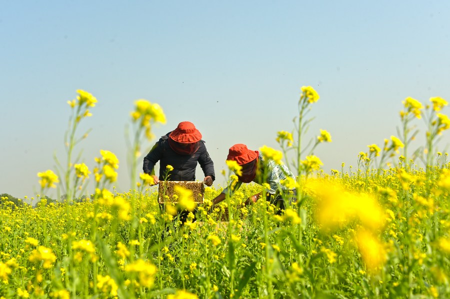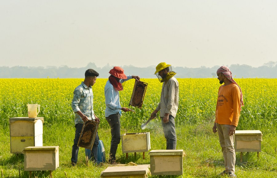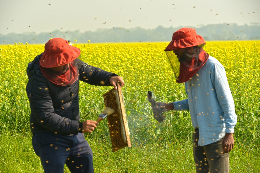 Beekeepers busy collecting honey from beehives at a mustard field in Munshiganj, Bangladesh on Dec. 29, 2023. (Xinhua)