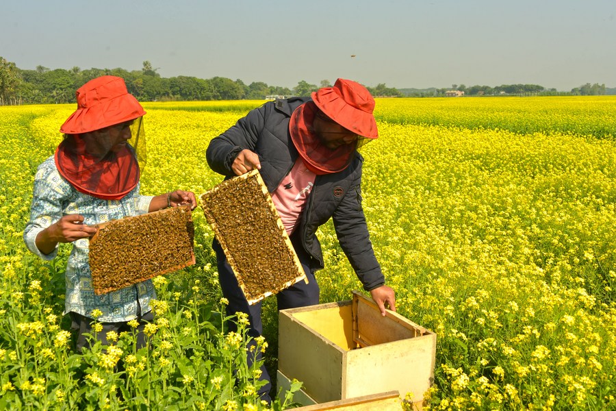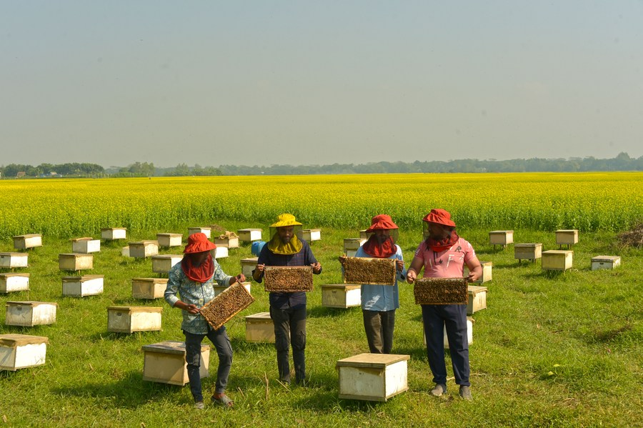 Beekeepers process beehives at a mustard field in Munshiganj, Bangladesh on Dec. 29, 2023. (Xinhua)