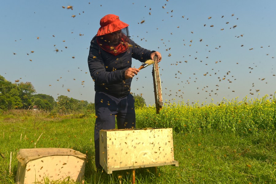 A beekeeper is busy collecting honey from beehives at a mustard field in Munshiganj, Bangladesh on Dec. 29, 2023. (Xinhua)