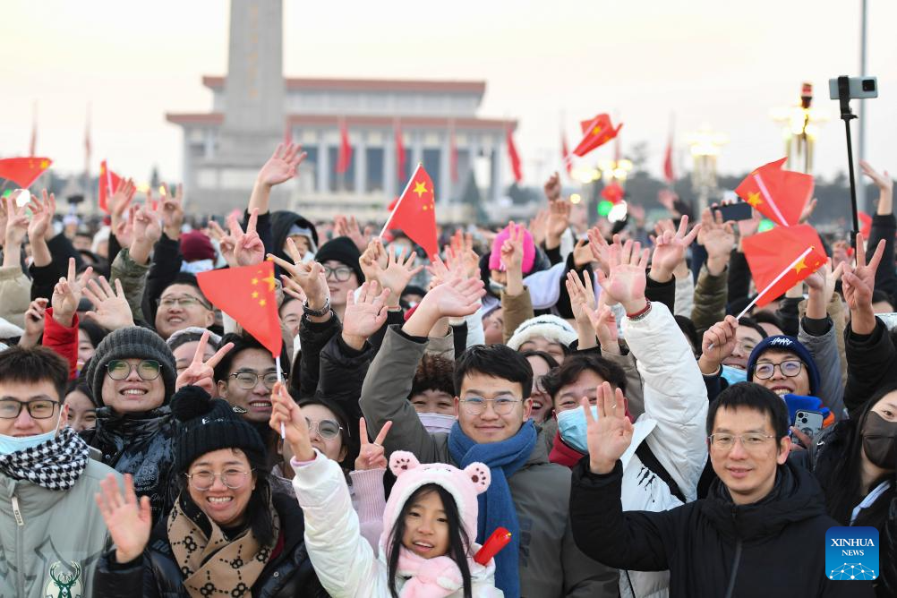 People hail after a grand national flag-raising ceremony at the Tian'anmen Square in Beijing, capital of China, Jan. 1, 2024. (Xinhua/Chen Zhonghao)
