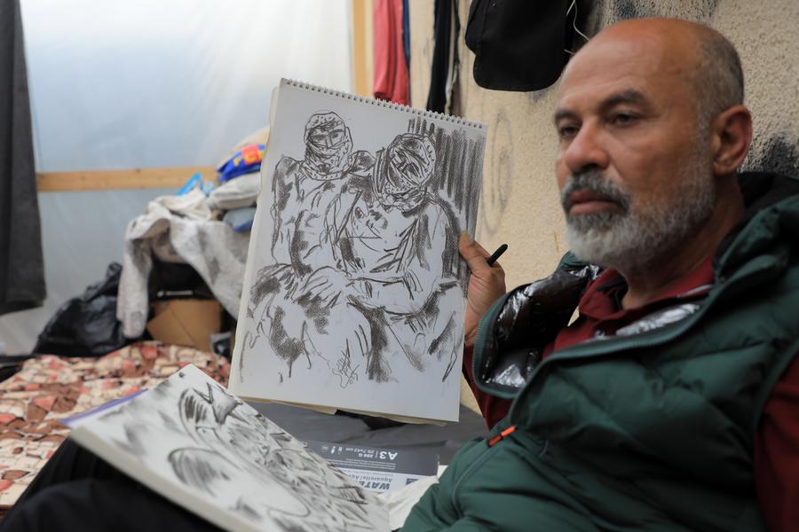 Basil Al-Maqousi, a 45-year-old Palestinian painter, draws a picture every day after he and his family were forced to flee from Gaza City to the southern Gaza Strip city of Rafah.