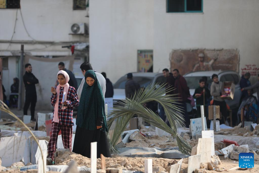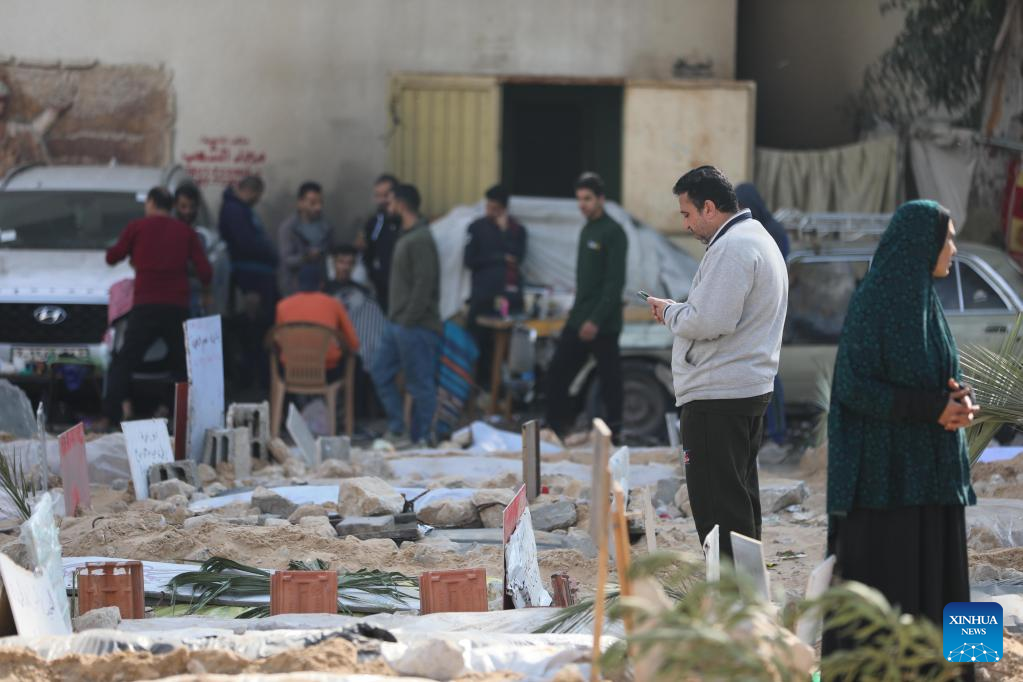 People mourn dead Palestinians at the graves in Al-Shifa Hospital in Gaza City, Dec. 31, 2023. The Palestinian Central Bureau of Statistics said Sunday that more Palestinians were killed in conflicts in 2023 than in any other year since 1948.(Photo by Mohammed Ali/Xinhua)