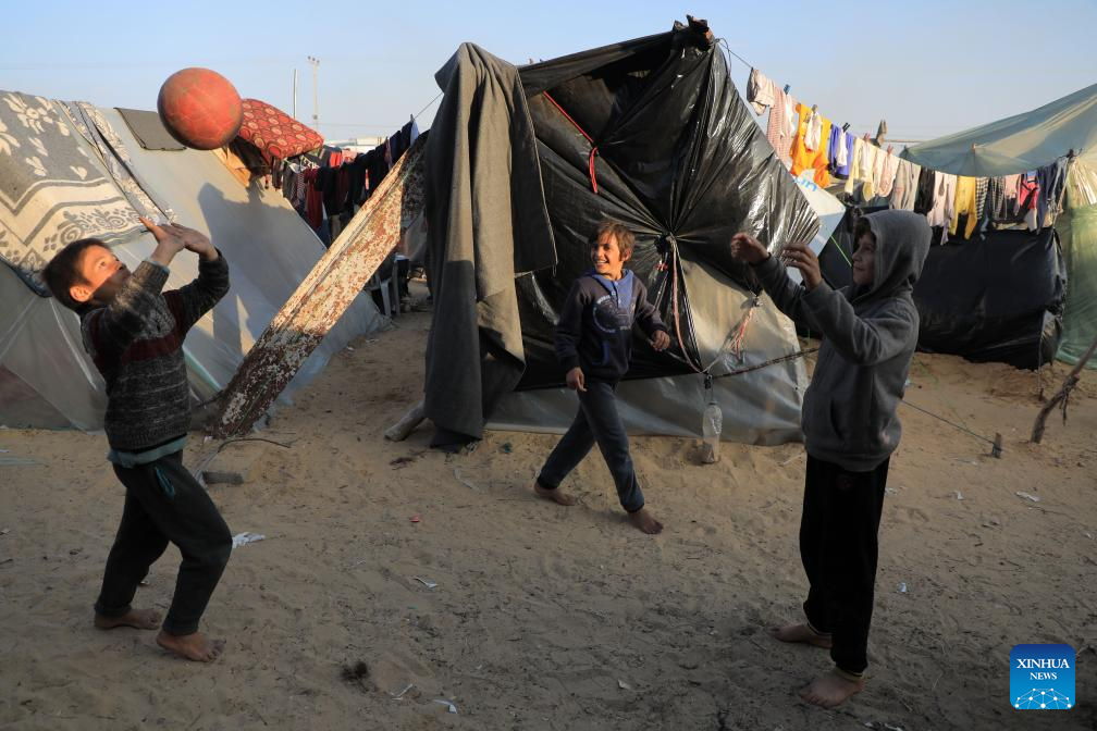 Children play at a temporary camp between the Gaza Strip and Egypt on Dec. 31, 2023. The Palestinian Central Bureau of Statistics said Sunday that more Palestinians were killed in conflicts in 2023 than in any other year since 1948. (Photo by Rizek Abdeljawad/Xinhua)