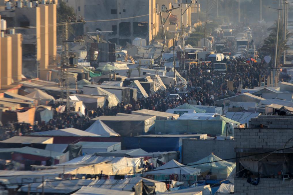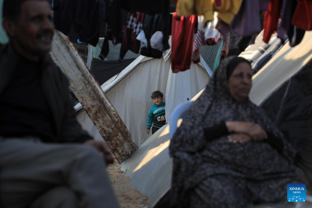 People are seen at a temporary camp between the Gaza Strip and Egypt on Dec. 31, 2023. The Palestinian Central Bureau of Statistics said Sunday that more Palestinians were killed in conflicts in 2023 than in any other year since 1948. (Photo by Rizek Abdeljawad/Xinhua)