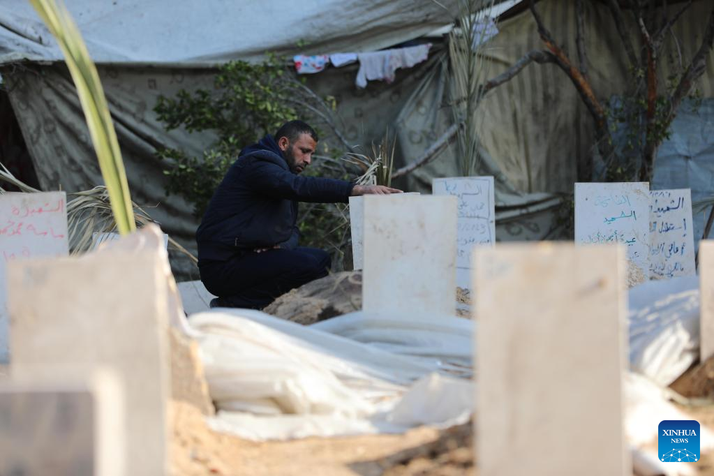 A man mourns dead Palestinians at the graves in Al-Shifa Hospital in Gaza City, Dec. 31, 2023. The Palestinian Central Bureau of Statistics said Sunday that more Palestinians were killed in conflicts in 2023 than in any other year since 1948.(Photo by Mohammed Ali/Xinhua)