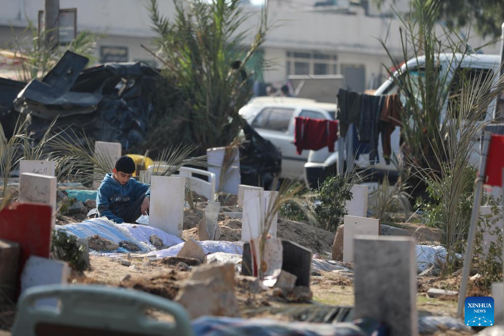 A boy mourns dead Palestinians at the graves in Al-Shifa Hospital in Gaza City, Dec. 31, 2023. The Palestinian Central Bureau of Statistics said Sunday that more Palestinians were killed in conflicts in 2023 than in any other year since 1948.(Photo by Mohammed Ali/Xinhua)
