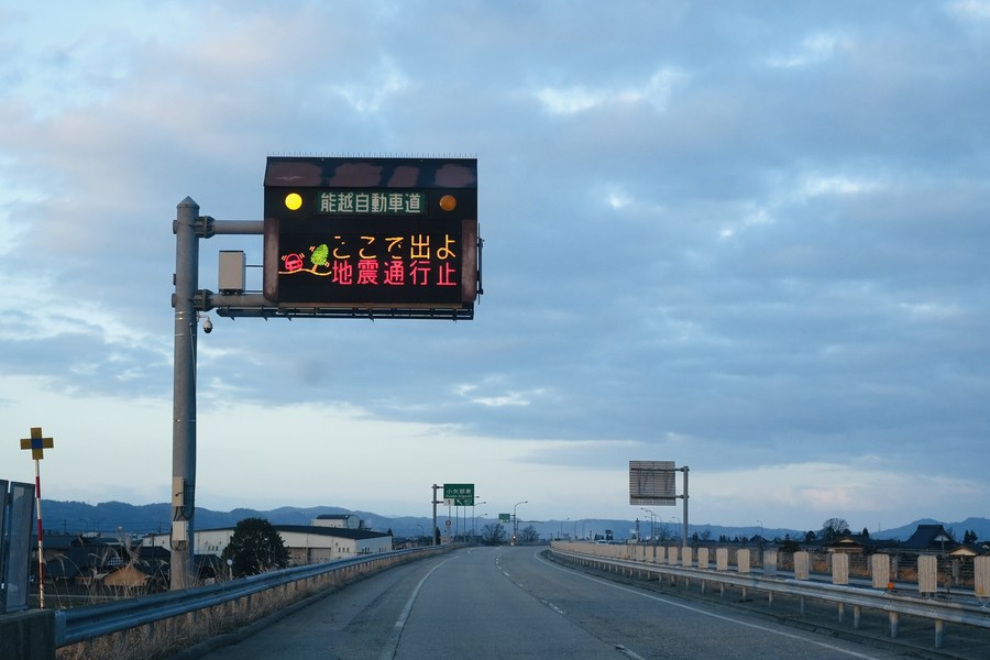 A road sign reading "No passing due to earthquakes" is seen in Oyabe City of Toyama Prefecture, Japan, Jan. 1, 2024. (Photo by Sun Jialin/Xinhua)