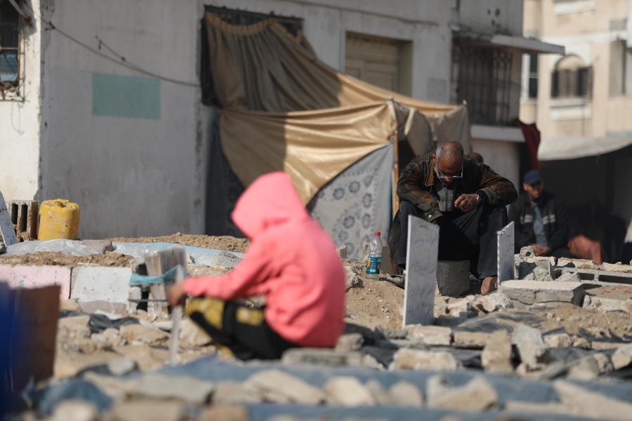 People mourn dead Palestinians at the graves in Al-Shifa Hospital in Gaza City, Dec. 31, 2023. The Palestinian Central Bureau of Statistics said Sunday that more Palestinians were killed in conflicts in 2023 than in any other year since 1948. According to the bureau, 22,404 Palestinians died in 2023, and 22,141 of them were killed since the outbreak of the conflict between Israel and the Gaza-ruling Hamas on Oct. 7, 2023. The bureau said 98 percent of the Palestinian fatalities were in Gaza, including nearly 9,000 children and 6,450 women, adding that 319 Palestinians were killed in the West Bank since Oct. 7, 2023. (Photo by Mohammed Ali/Xinhua)