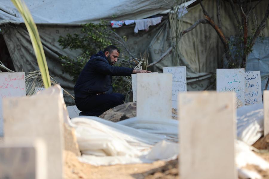 A man mourns dead Palestinians at the graves in Al-Shifa Hospital in Gaza City, Dec. 31, 2023. The Palestinian Central Bureau of Statistics said Sunday that more Palestinians were killed in conflicts in 2023 than in any other year since 1948. According to the bureau, 22,404 Palestinians died in 2023, and 22,141 of them were killed since the outbreak of the conflict between Israel and the Gaza-ruling Hamas on Oct. 7, 2023. The bureau said 98 percent of the Palestinian fatalities were in Gaza, including nearly 9,000 children and 6,450 women, adding that 319 Palestinians were killed in the West Bank since Oct. 7, 2023. (Photo by Mohammed Ali/Xinhua)■