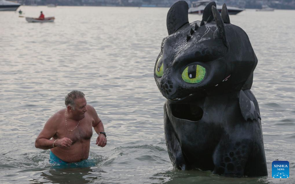A person in dinosaur costume (R) participates in the 104th annual Polar Bear Swim at English Bay in Vancouver, British Columbia, Canada, on Jan. 1, 2024. (Photo by Liang Sen/Xinhua)