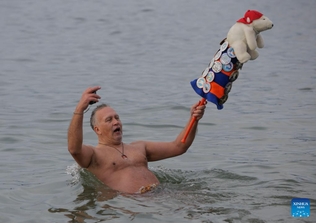 A person takes part in the 104th annual Polar Bear Swim at English Bay in Vancouver, British Columbia, Canada, on Jan. 1, 2024. (Photo by Liang Sen/Xinhua)