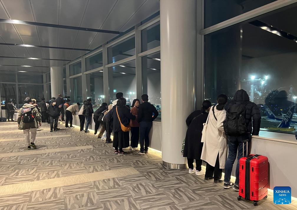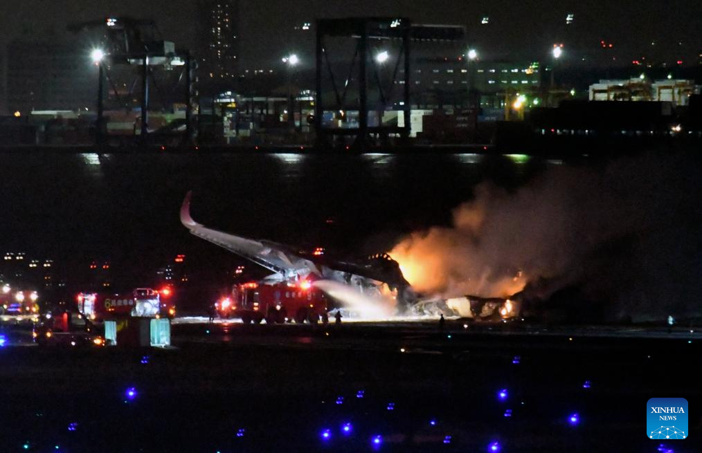 The Japan Airlines Flight 516 heading from New Chitose Airport in Hokkaido Prefecture to Tokyo's Haneda Airport collided with a Japan Coast Guard aircraft after landing at Haneda Airport, the report said. (Xinhua/Yue Chenxing)