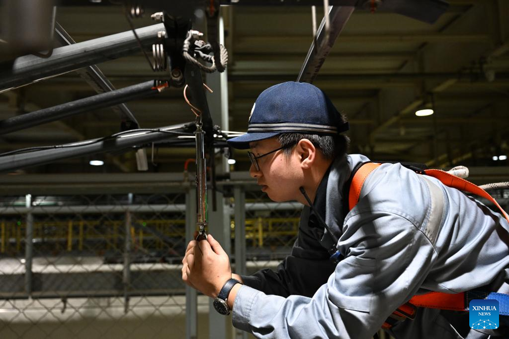A staff member checks the pantograph of a high-speed electrical multiple unit (EMU) train at a maintenance station in Hohhot, north China's Inner Mongolia Autonomous Region, Jan. 2, 2024. Staff members at the maintenance station were busy servicing the EMU trains on Tuesday so as to guarantee their normal operations after the New Year holiday travel rush. (Xinhua/Bei He)
