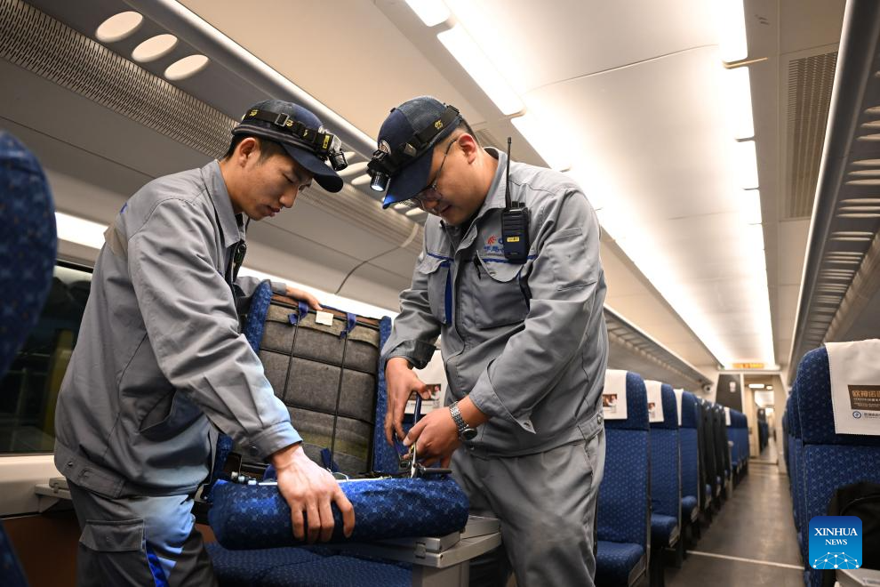 Staff members repair a damaged chair on a high-speed electrical multiple unit (EMU) train at a maintenance station in Hohhot, north China's Inner Mongolia Autonomous Region, Jan. 2, 2024. Staff members at the maintenance station were busy servicing the EMU trains on Tuesday so as to guarantee their normal operations after the New Year holiday travel rush. (Xinhua/Bei He)