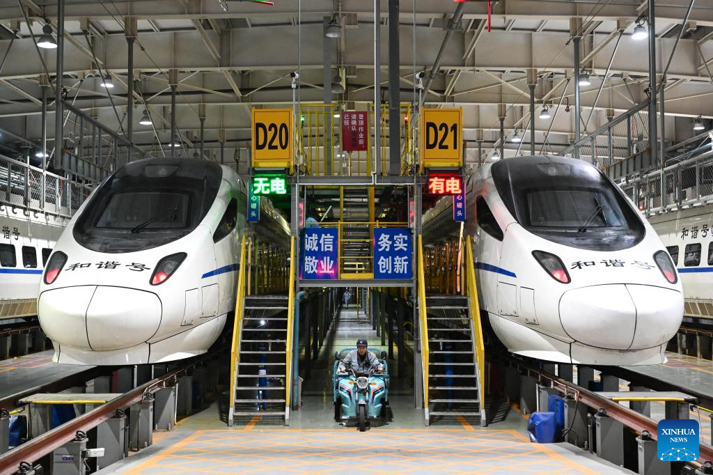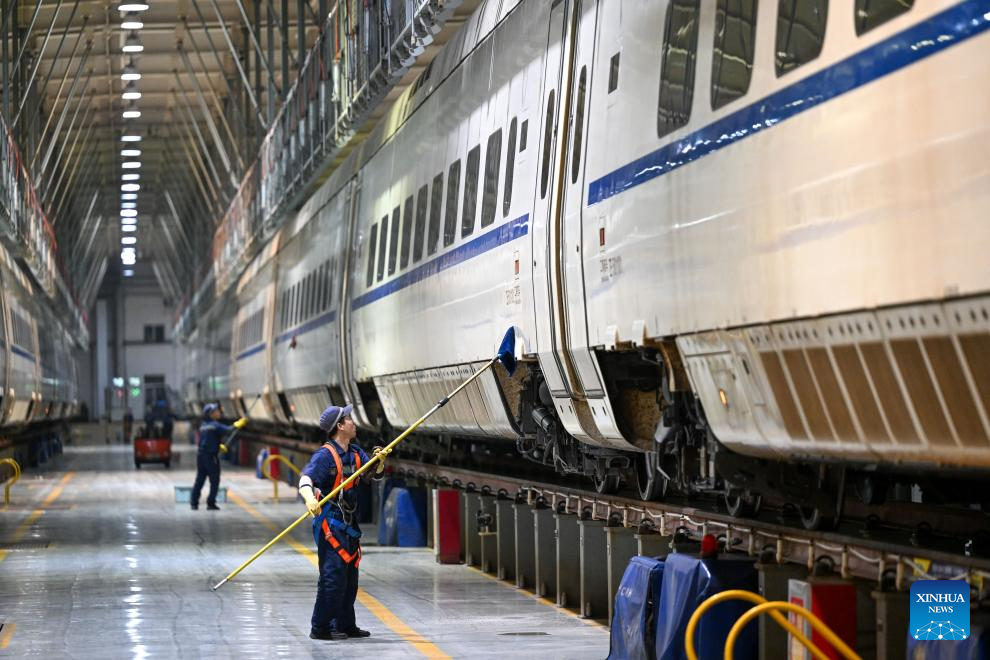 Staff members clean the exterior of a high-speed electrical multiple unit (EMU) train at a maintenance station in Hohhot, north China's Inner Mongolia Autonomous Region, Jan. 2, 2024. Staff members at the maintenance station were busy servicing the EMU trains on Tuesday so as to guarantee their normal operations after the New Year holiday travel rush. (Xinhua/Bei He)