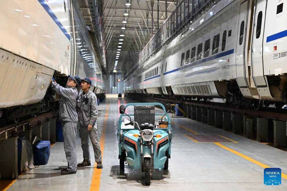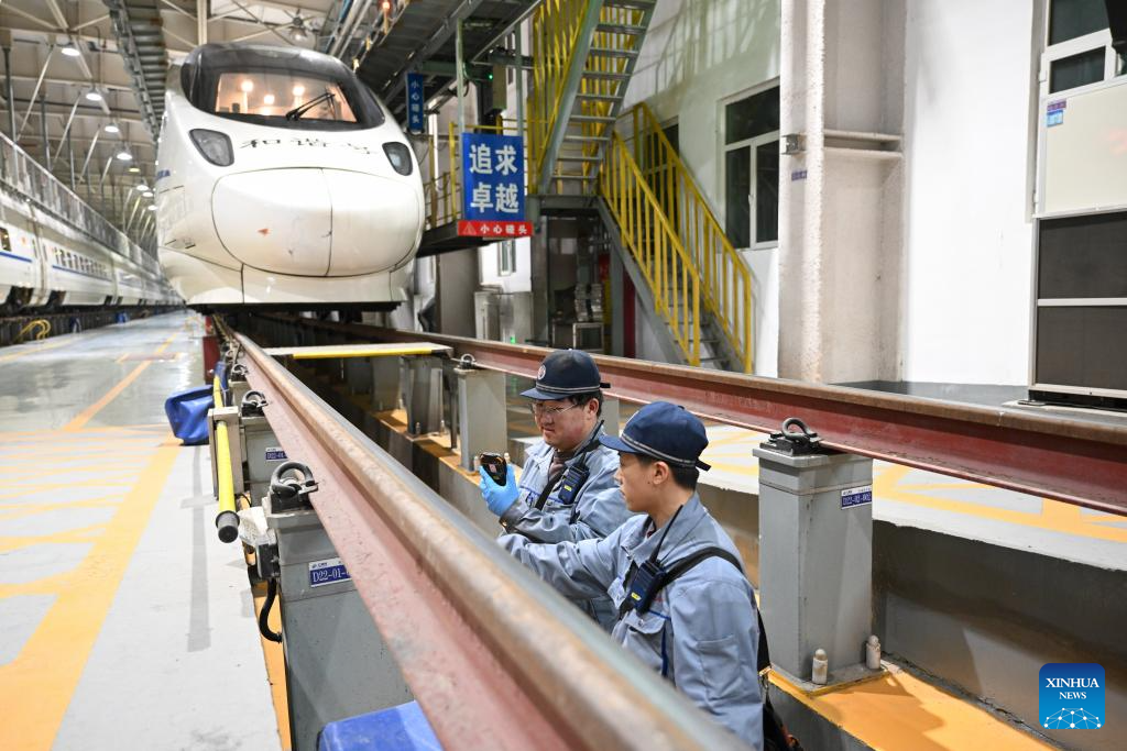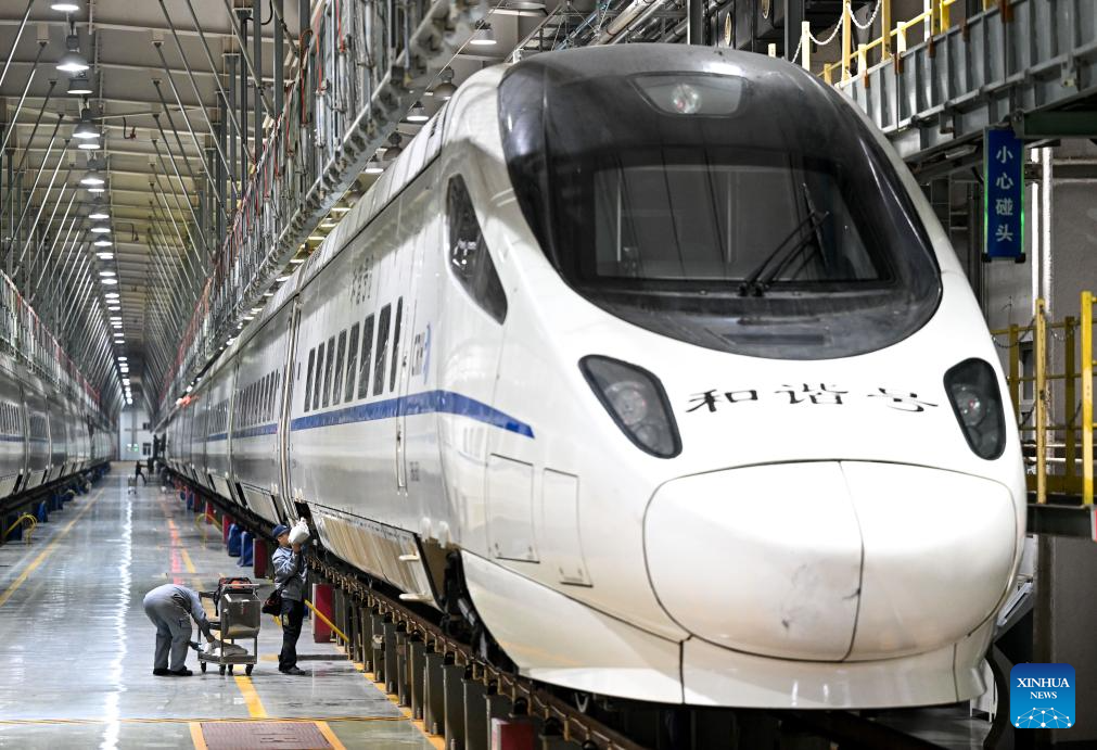 Staff members check the nose part of a high-speed electrical multiple unit (EMU) train at a maintenance station in Hohhot, north China's Inner Mongolia Autonomous Region, Jan. 2, 2024. Staff members at the maintenance station were busy servicing the EMU trains on Tuesday so as to guarantee their normal operations after the New Year holiday travel rush. (Xinhua/Bei He)