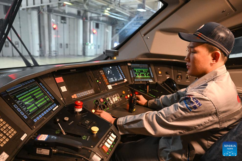 A staff member performs in-cab function tests in the driver cabin at a maintenance station in Hohhot, north China's Inner Mongolia Autonomous Region, Jan. 2, 2024. Staff members at the maintenance station were busy servicing the EMU trains on Tuesday so as to guarantee their normal operations after the New Year holiday travel rush. (Xinhua/Bei He)
