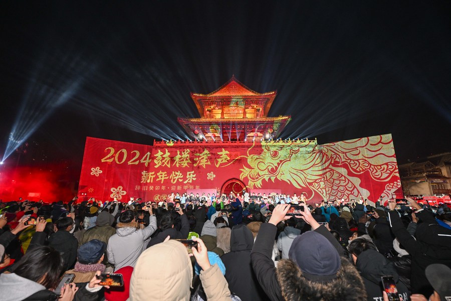 People wait for the New Year bell tolls at the Drum Tower in Tianjin, north China, Jan. 1, 2024. (Xinhua/Sun Fanyue)